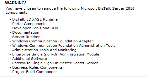 2. Once you have your installation media downloaded and you have backed up all your BizTalk apps you can proceed to uninstall through control panel, when I did mine it mentioned that the following components will be removed.