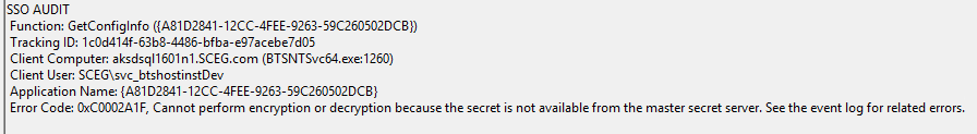 SSO Audit – Error Code 0xC0002A1F, “Cannot perform encryption or decryption because the secret is not available from the master secret server. See the event log for related errors.”